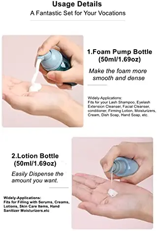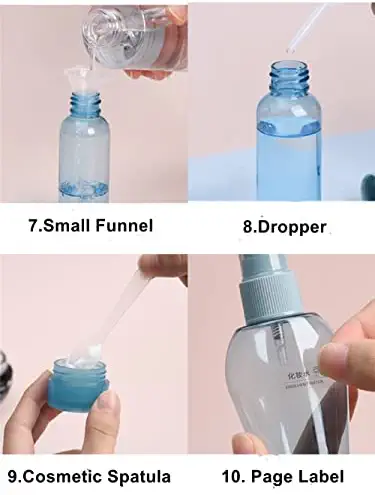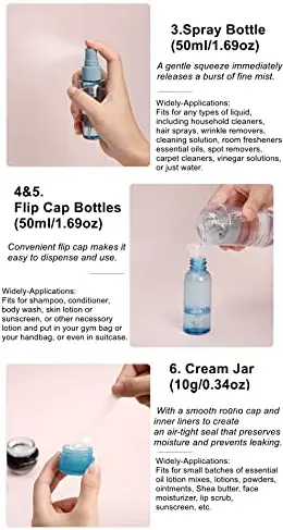 We believe everyone is INFINITE! Model: HAT-50ml*6PCS Material:PET/PP Specification: 1*50ml/1.69oz Foam Pump Bottle+1*50ml/1.69oz Spray Bottle+1*50ml/1.69oz Lotion Bottle + 2*50ml/1.69oz Flip Cap Bottle + 1*10g/ 0.34oz Cream Jar+ 1*Cosmetic Spatula+1*Mini Funnel+1*Dropper + 1*Page Label + 1*Storage Bag Suitable Temperature:-20°C~40°C(-4°F~104°F) Features: -Environment friendly, safe and odorless. -Suitable to subpackage personal skin care producsts, such as facial cleanser, toner, lotion, shampoo, shower gel, hair conditioner etc. NOTICE:DON’T WORRY!It can work WITHOUT STRAWS !!! These airless bottles are designed without straws to keep fresher for longer, increasing their shelf-life and preventing the oxidation of the cosmetics and the growth of bacteria.